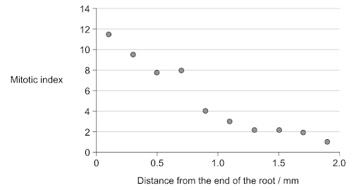 The graph shows the mitotic index in the roots of lentil plants at different distances from the end of the root.