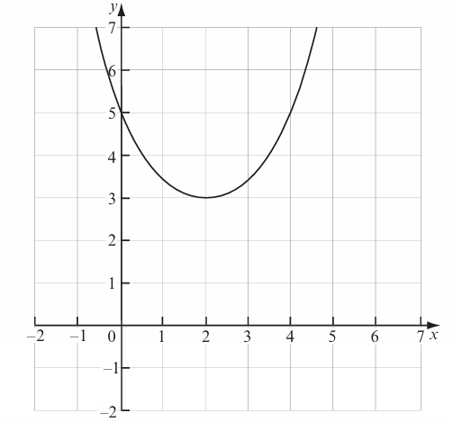 (b) The diagram shows part of the graph of another quadratic function `g`. It can be written in the form `g(x)=a(x-h)^2+3`. Its vertex is at `(2,3)` and its y-intercept is `5`.