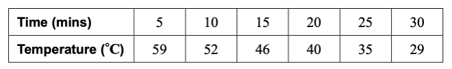 A cup of hot water is placed in a room and is left to cool for half an hour. Its temperature, measured in °C, is recorded every 5 minutes. The results are shown in the table.