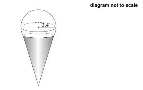 Ruhi buys a scoop of ice cream in the shape of a sphere with a radius of 3.4 cm. The ice cream is served in a cone, and it may be assumed that `1/5` of the volume of the ice cream is inside the cone. This is shown in the following diagram.