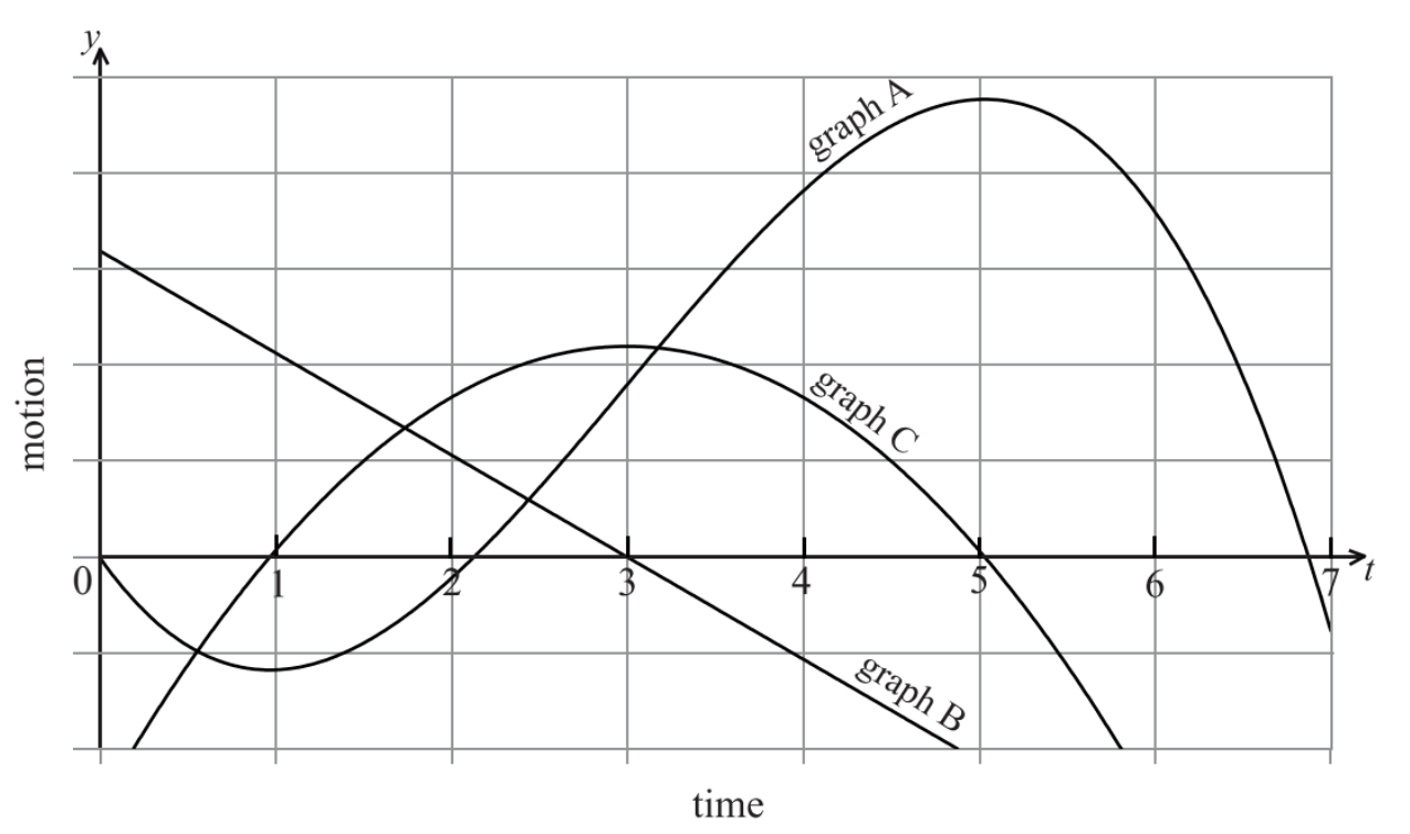 The following diagram shows the graphs of the displacement, velocity, and acceleration of a moving object as functions of time, t.