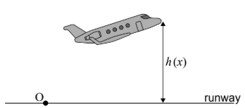 A plane takes off from a horizontal runway. Let point O be the point where the plane begins to leave the runway and x be the horizontal distance, in km, of the plane from O. The function h models the vertical height, in km, of the nose of the plane from the horizontal runway, and is defined by