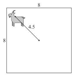 A square field with side 8 m has a goat tied to a post in the centre by a rope such that the goat can reach all parts of the field up to 4.5 m from the post.