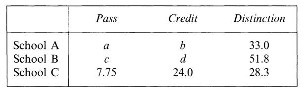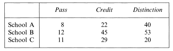 (ii) Three schools from the same city enter students for an examination in which successful candidates can achieve one of three grades: Pass, Credit, Distinction. The results are shown in the following table