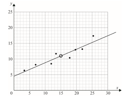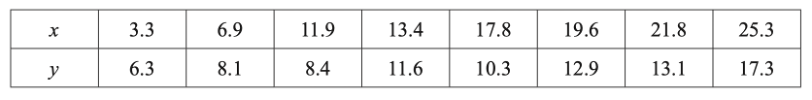 The relationship between `x` and `y` can be modelled by the regression line of `y` on `x` with equation `y=ax+b`, where `a,b in RR`.