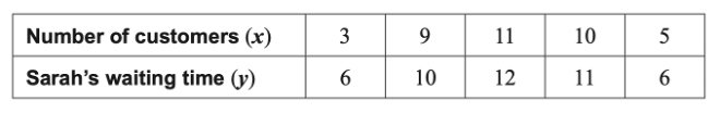Sarah, a regular customer, visited the café on five consecutive days. The following table shows the number of customers, `x`, ahead of Sarah who have already ordered and are waiting to receive their coffee and Sarah’s waiting time, `y` minutes.