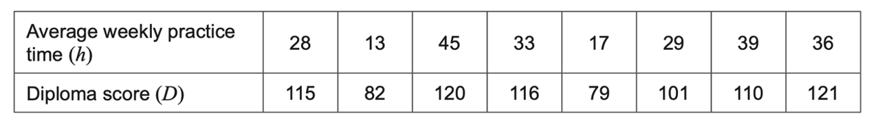 In Lucy’s music academy, eight students took their piano diploma examination and achieved scores out of 150. For her records, Lucy decided to record the average number of hours per week each student reported practicing in the weeks prior to their examination. These results are summarized in the table below.