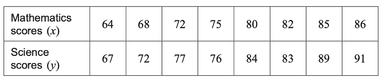 The following table shows the Mathematics test scores `(x)` and the Science test scores `(y)` for a group of eight students.