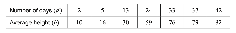 The following table shows the number of days, `d`, that the experiment has been running and the average height, `h` cm, of the plants on each of those days.