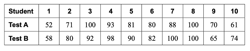 A class is given two tests, Test A and Test B. Each test is scored out of a total of 100 marks. The scores of the students are shown in the following table.