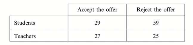 (iv) The manufacturer of ‘Fizz’, a popular soft drink, offered Millennium University one million dollars per year to make ‘Fizz’ the only soft drink sold on campus. A group of 140 students and teachers were consulted on whether the university should accept or reject the offer. Their responses are summarized in the following table: