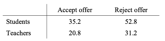 (a) Construct a table of expected frequencies assuming that the attitude towards the offer is independent of whether the person is a student or a teacher. Do not apply Yates’ continuity correction.