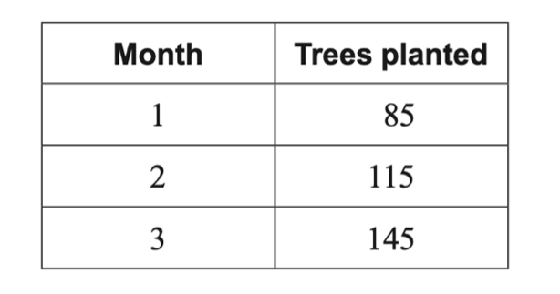 In the first month of a reforestation program, the town of Neerim plants 85 trees. Each subsequent month the number of trees planted will increase by an additional 30 trees.