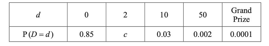 In a local weekly lottery, tickets cost $2 each. In the first week of the lottery, a player will receive $D for each ticket, with the probability distribution shown in the following table. For example, the probability of a player receiving $10 is 0.03. The grand prize in the first week of the lottery is $1000.