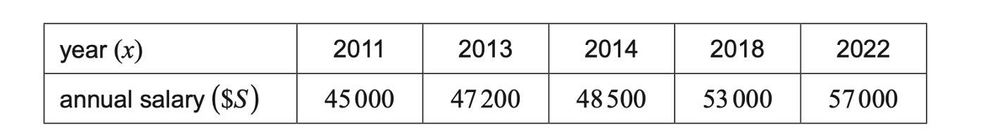 (a) Find Gemma’s annual salary for the year 2021, to the nearest dollar. Kaia’s annual salary is based on a yearly performance review. Her salary for the years 2011, 2013, 2014, 2018, and 2022 is shown in the following table.