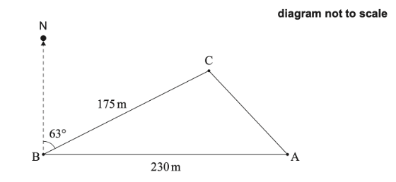 From point B, he walks 175 metres on a bearing of `063^@` to reach point C.