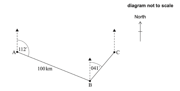 Jason sails his boat from point A for a distance of 100 km, on a bearing of `112^@`, to arrive at point B. He then sails on a bearing of `041^@` to point C. Jason’s journey is shown in the diagram.