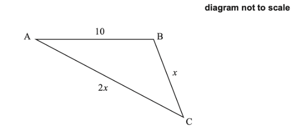 The following diagram shows triangle ABC, with `AB=10, BC=x` and `AC=2x`.