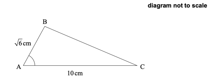 In the following triangle ABC, `AB = sqrt 6` cm, `AC=10` cm and `cos hat (BAC)=1/5`.