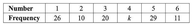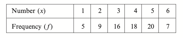 A box contains 100 cards. Each card has a number between one and six written on it. The following table shows the frequencies for each number.