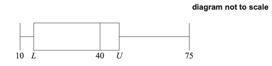 A research student weighed lizard eggs in grams and recorded the results. The following box and whisker diagram shows a summary of the results where L and U are the lower and upper quartiles respectively.