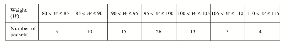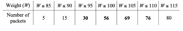 (e) One of the 80 packets is selected at random. Given that its weight satisfies `85 < W <= 110` find the probability that its weight is greater than 100 grams.