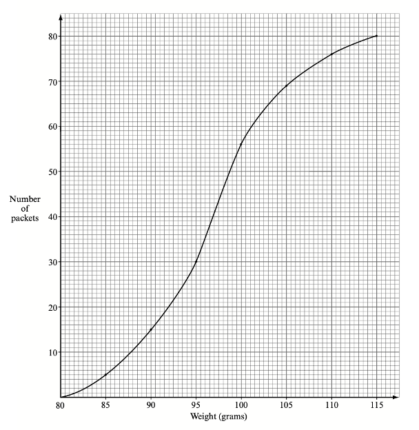 (c) A cumulative frequency graph of the distribution is shown below, with a scale 2 cm for 10 packets on the vertical axis and 2 cm for 5 grams on the horizontal axis.