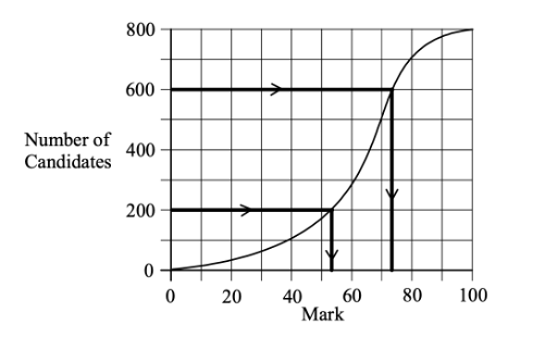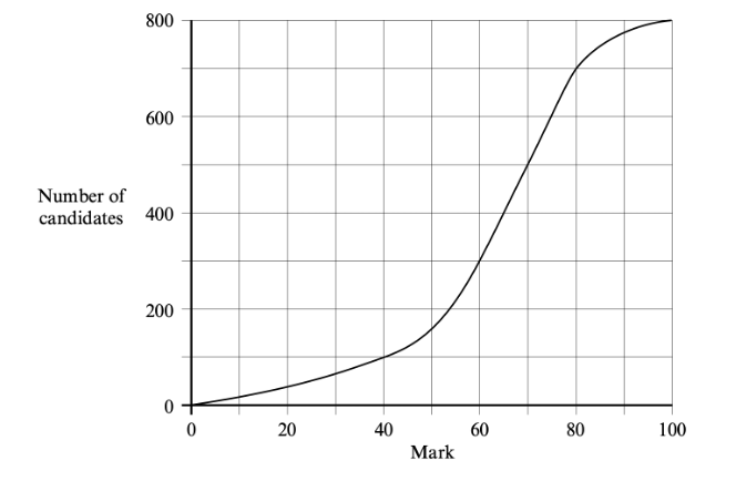 A test which is marked out of 100 is written by 800 students. The cumulative frequency graph for the results of the test is given below.