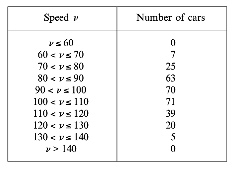 The speeds in km h–1 of cars passing a point on a highway are recorded in the following table.
