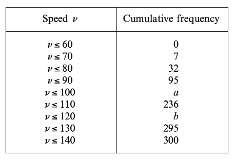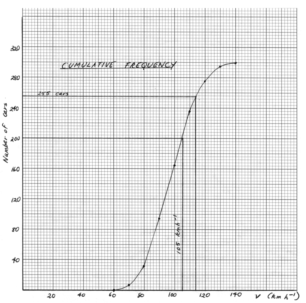 (ii) On graph paper, construct a cumulative frequency curve to represent this information. Use a scale of 1 cm for 10 km h–1 on the horizontal axis and a scale of 1 cm for 20 cars on the vertical axis.