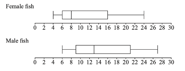 A scientist has 100 female fish and 100 male fish. She measures their lengths to the nearest cm. These are shown in the following box and whisker diagrams.